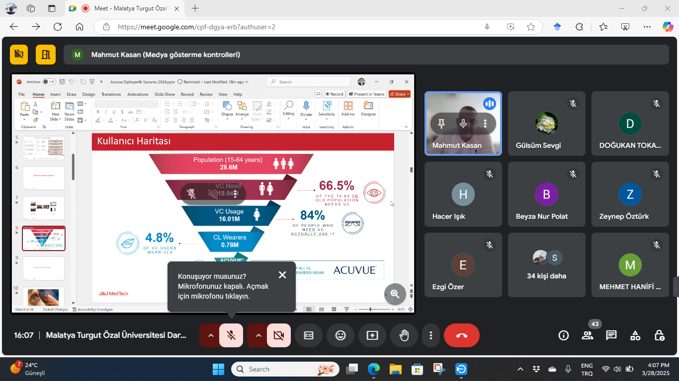 28 Mart 2025 tarihinde saat 16:00 - 17:00 arasında Google Meet platformu üzerinden çevrim içi olarak gerçekleştirilen eğitime, Optisyenlik bölümü öğrencileri yoğun ilgi gösterdi. Dr. Öğr. Üyesi Mehmet Hanifi Kebiroğlu tarafından yönetilen etkinlikte, Johnson & Johnson firmasından Mahmut Kasan tarafından Acuvue marka yumuşak kontakt lensler hakkında detaylı bilgiler verildi.